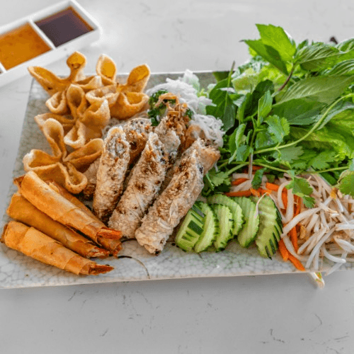 Grilled pork, beef, chicken, shrimps, rocket shrimps and egg rolls. Served with rice papers, vermicelli noodle, veggies and signature fish sauce.