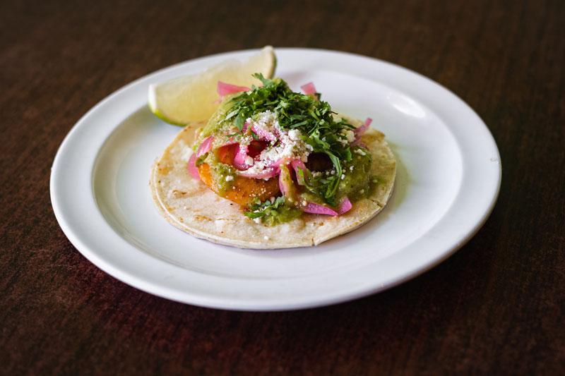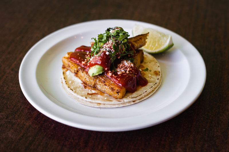 Pork belly rubbed with coffee and ancho chiles on a melted asadero tortilla, topped with guajillo salsa, avocado, cilantro and cotija cheese.