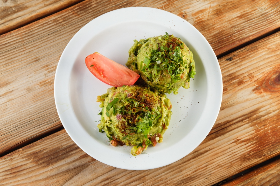 hand-mashed avocados, fresh tomatoes, red onion, cilantro, Serrano pepper and lime topped with green onions, chili powder and cilantro. Served with chips.