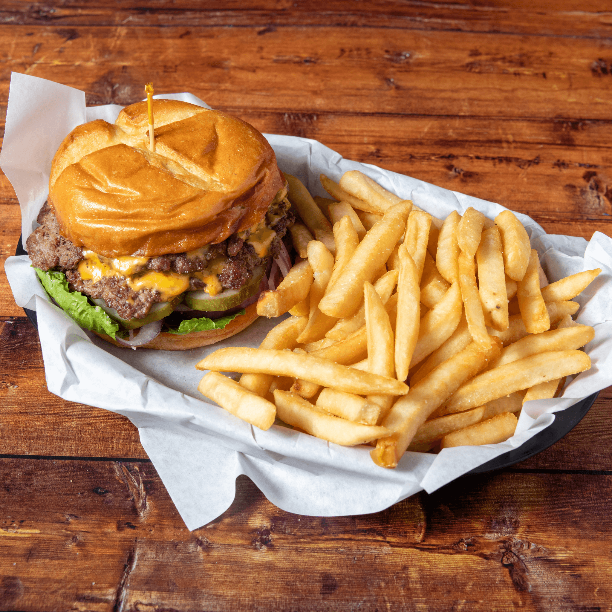Three angus beef sliders with American cheese and a dill pickle chip. Served with fries or tots or your choice of side substitute.