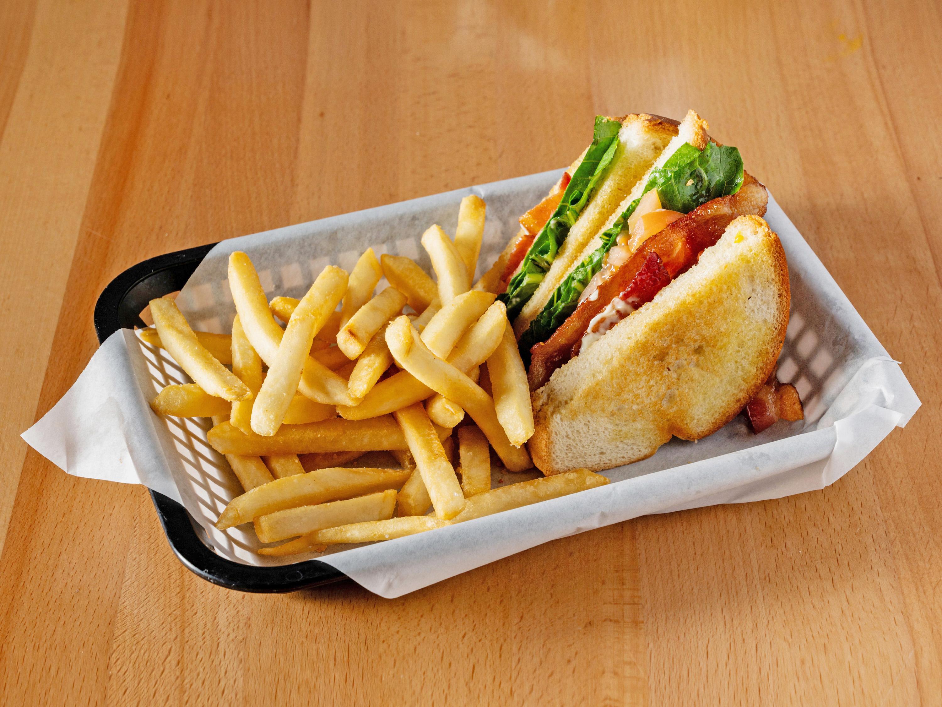 A generous portion of bacon with lettuce & tomatoes glued together with mayonnaise. Served on Texas toast. With your choice of side. ADD CHEESE $1.50