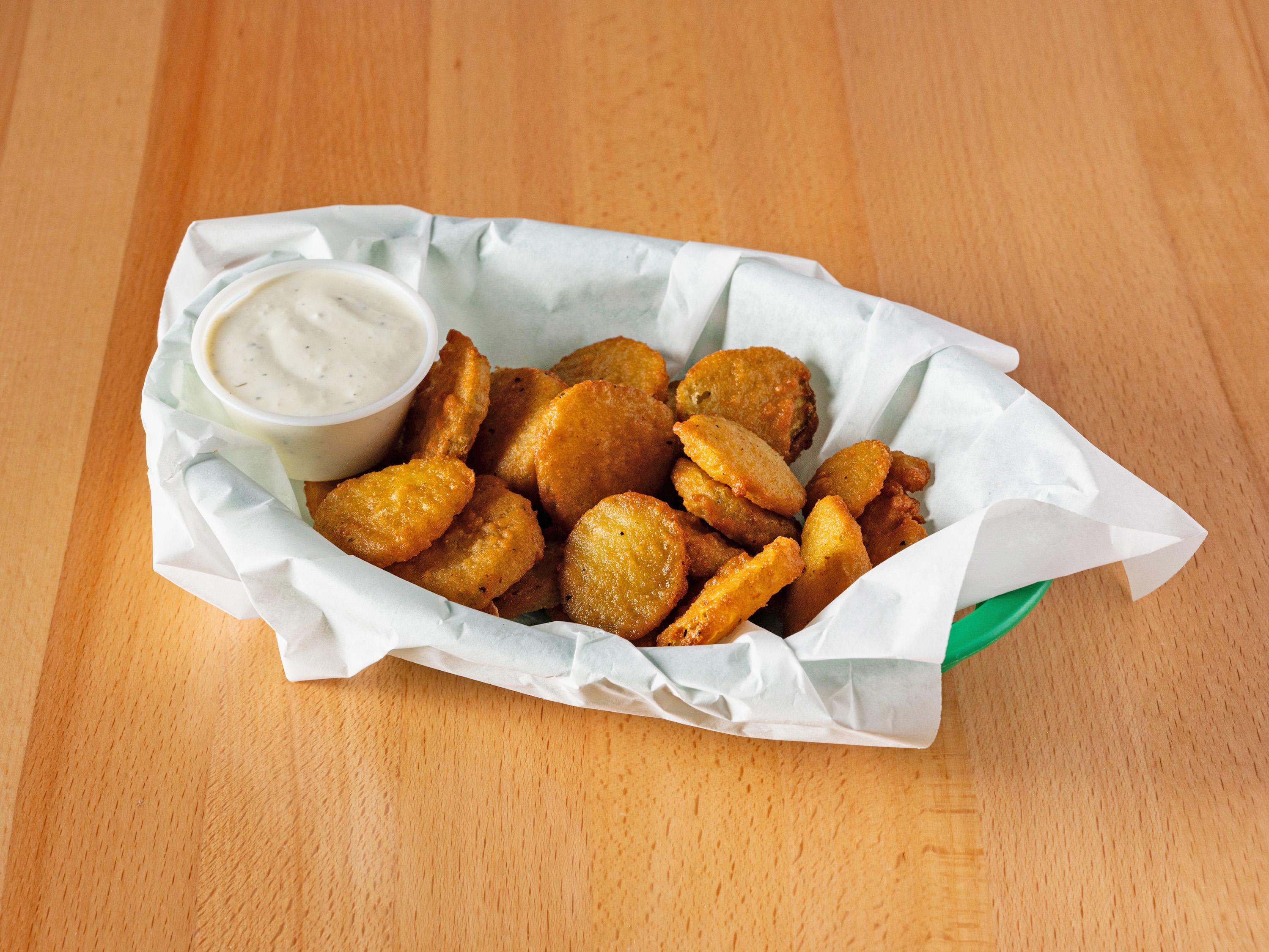 A basket of deep fried breaded dill pickle chips served with ranch. ADD CAJUN SPICE $1.50