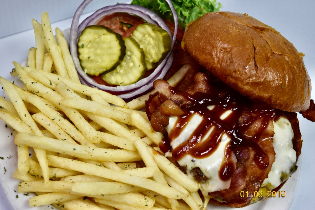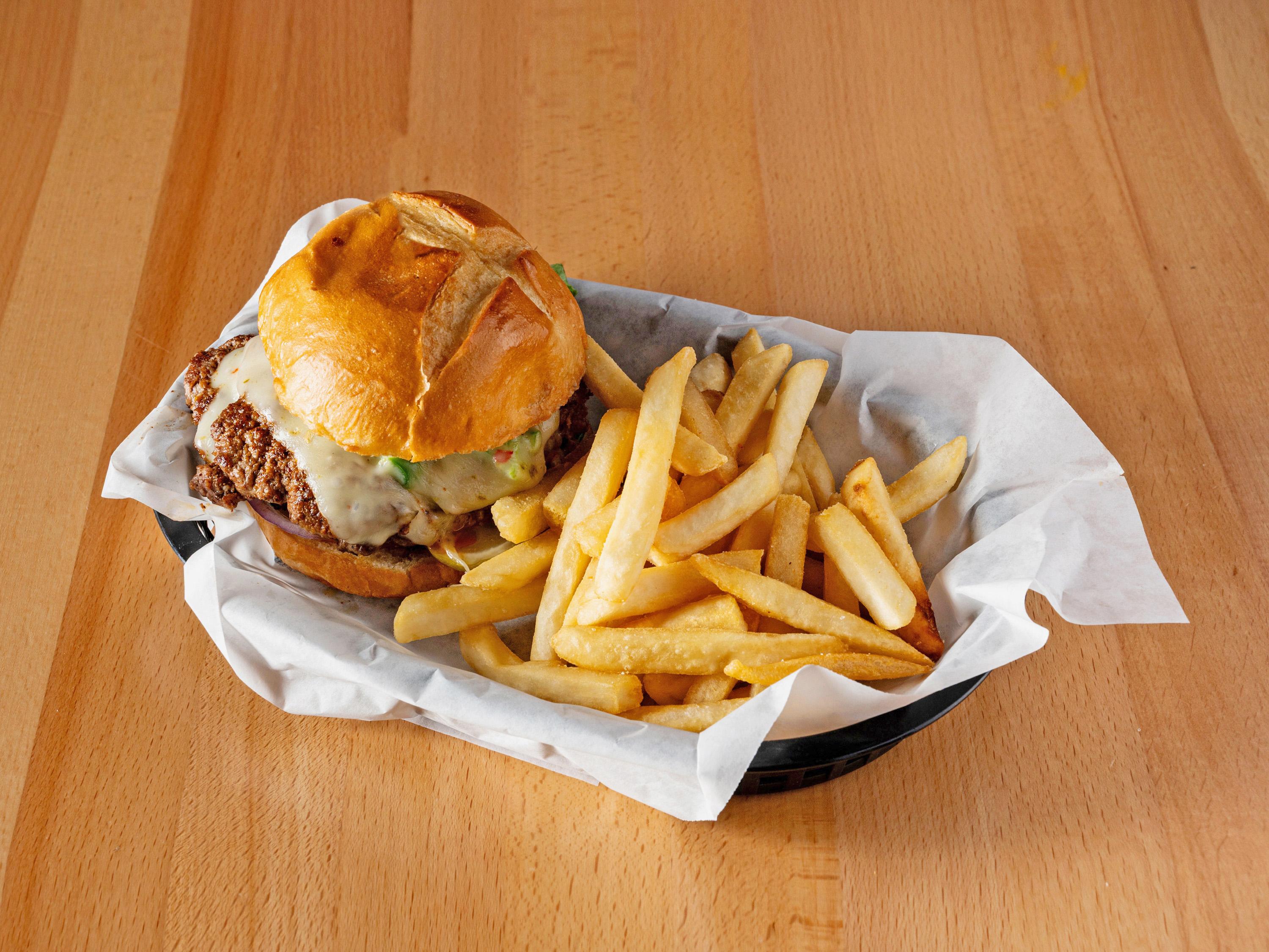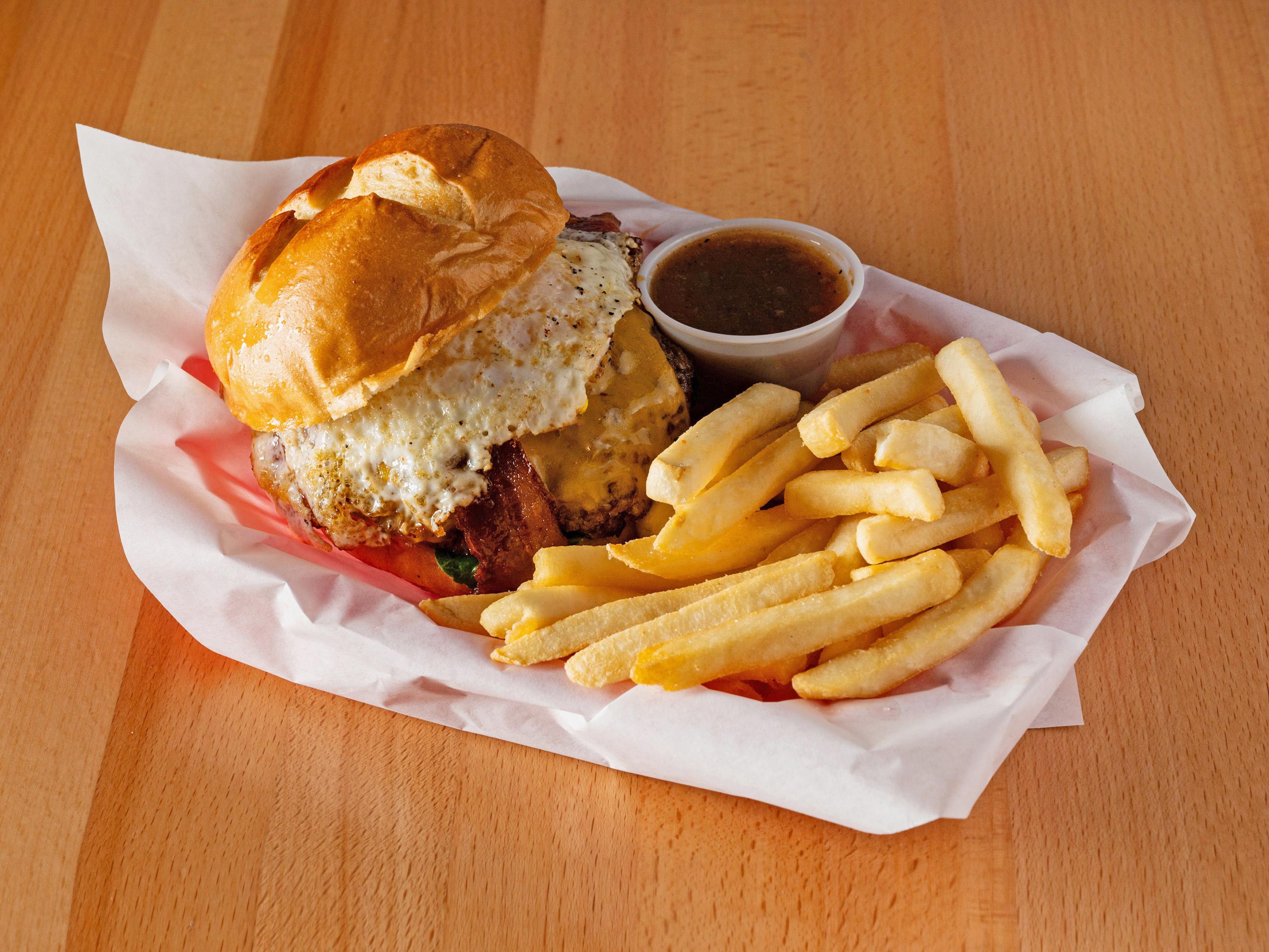 1/2lb hand pattied Angus Beef topped with bacon, house made green chile, cheddar cheese and a fried egg. With your choice of side. Lettuce, tomato, onions, pickles on request.