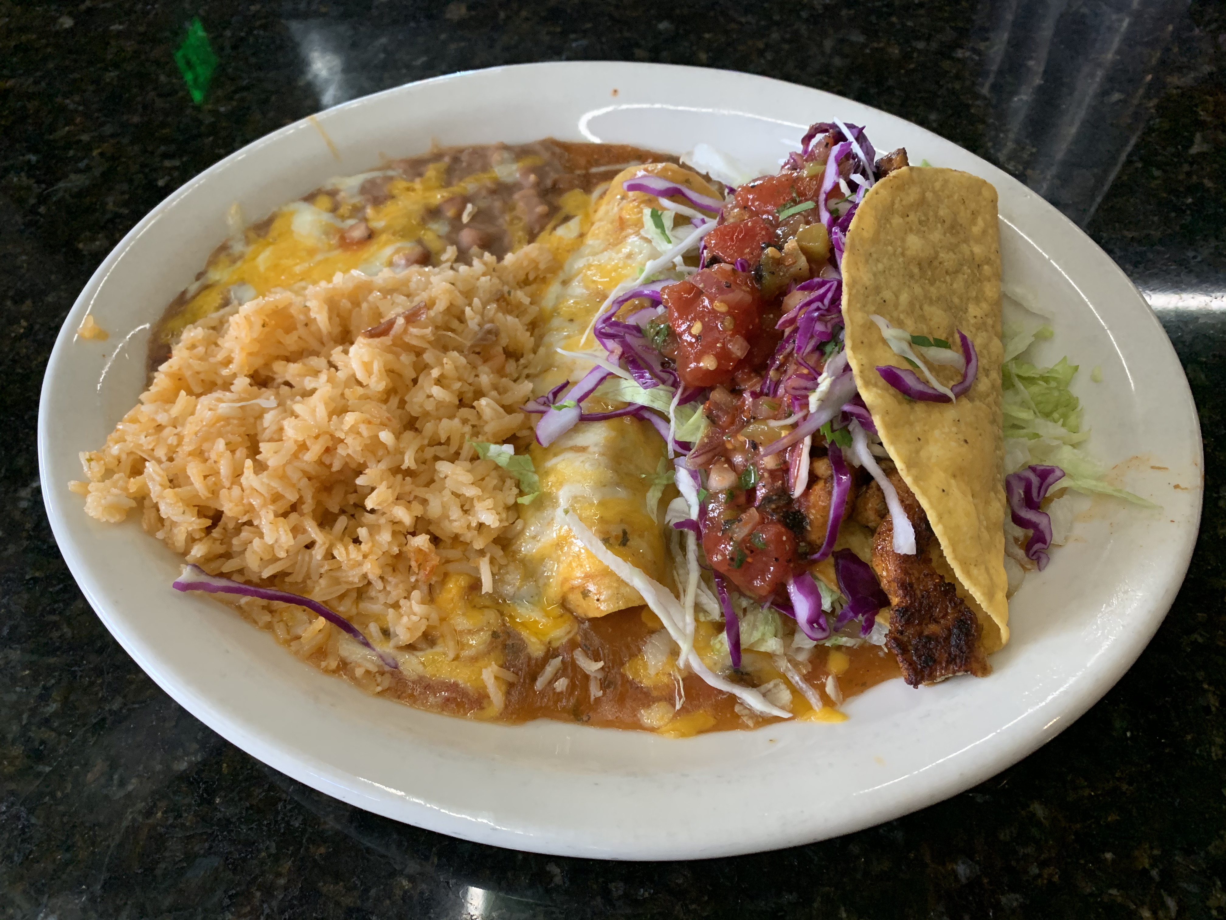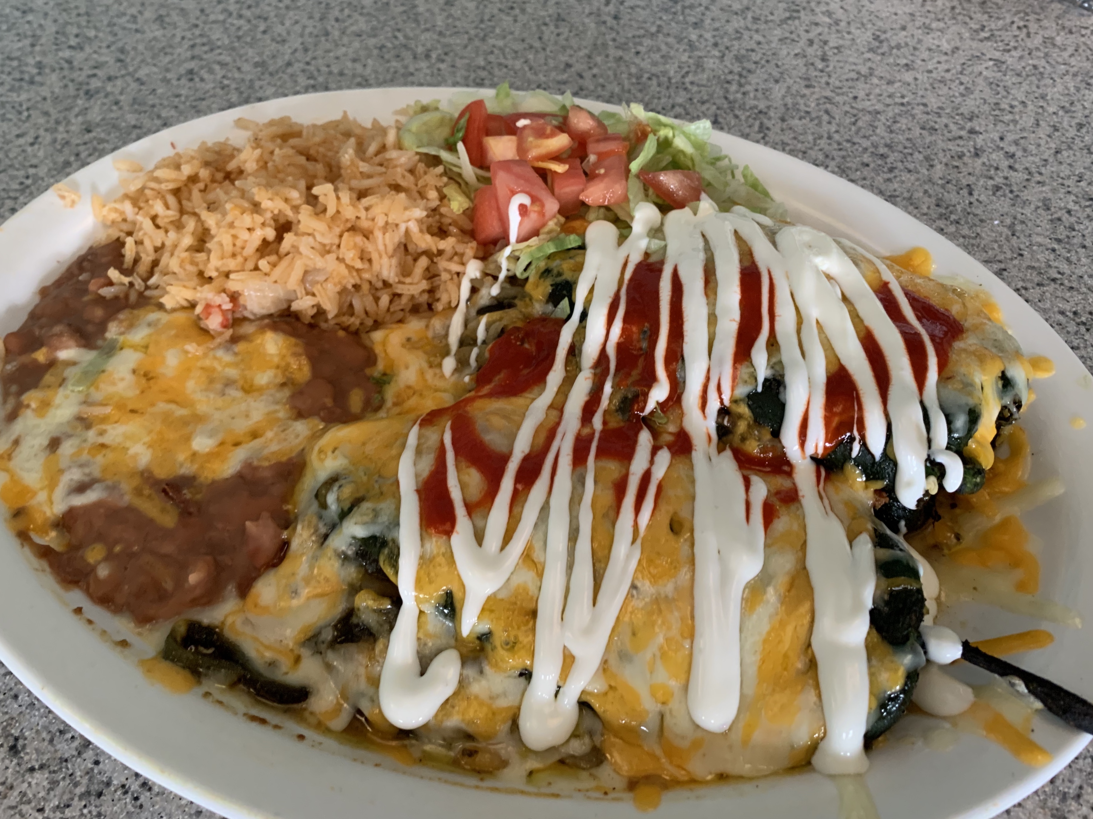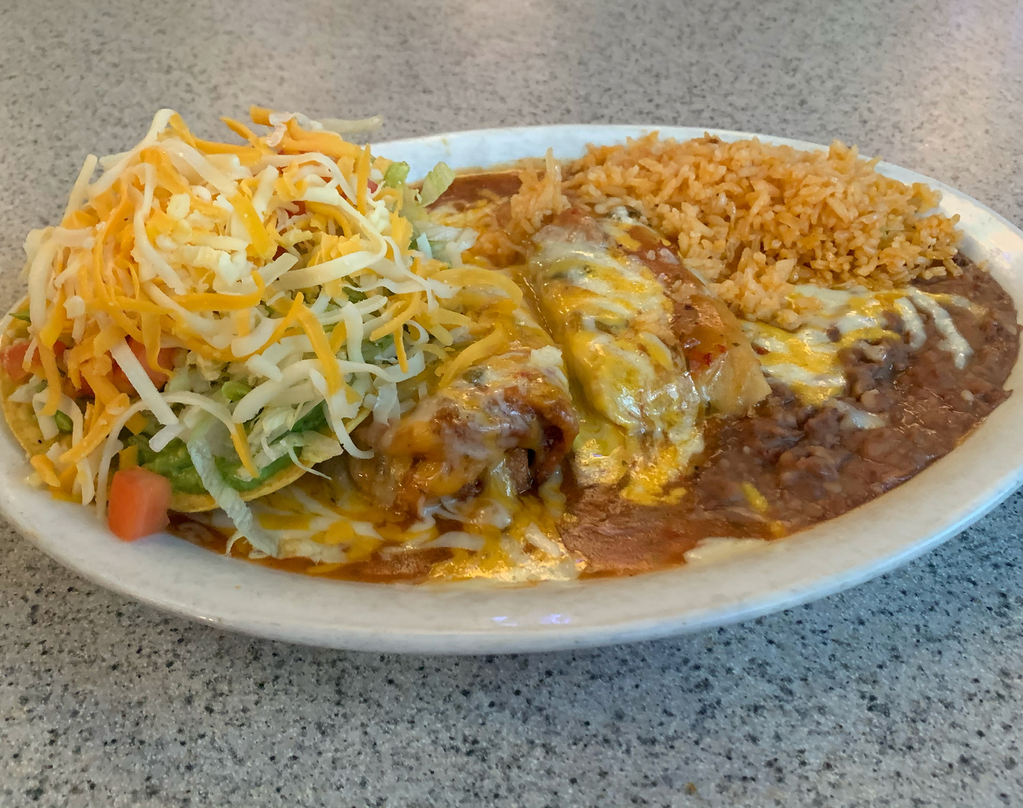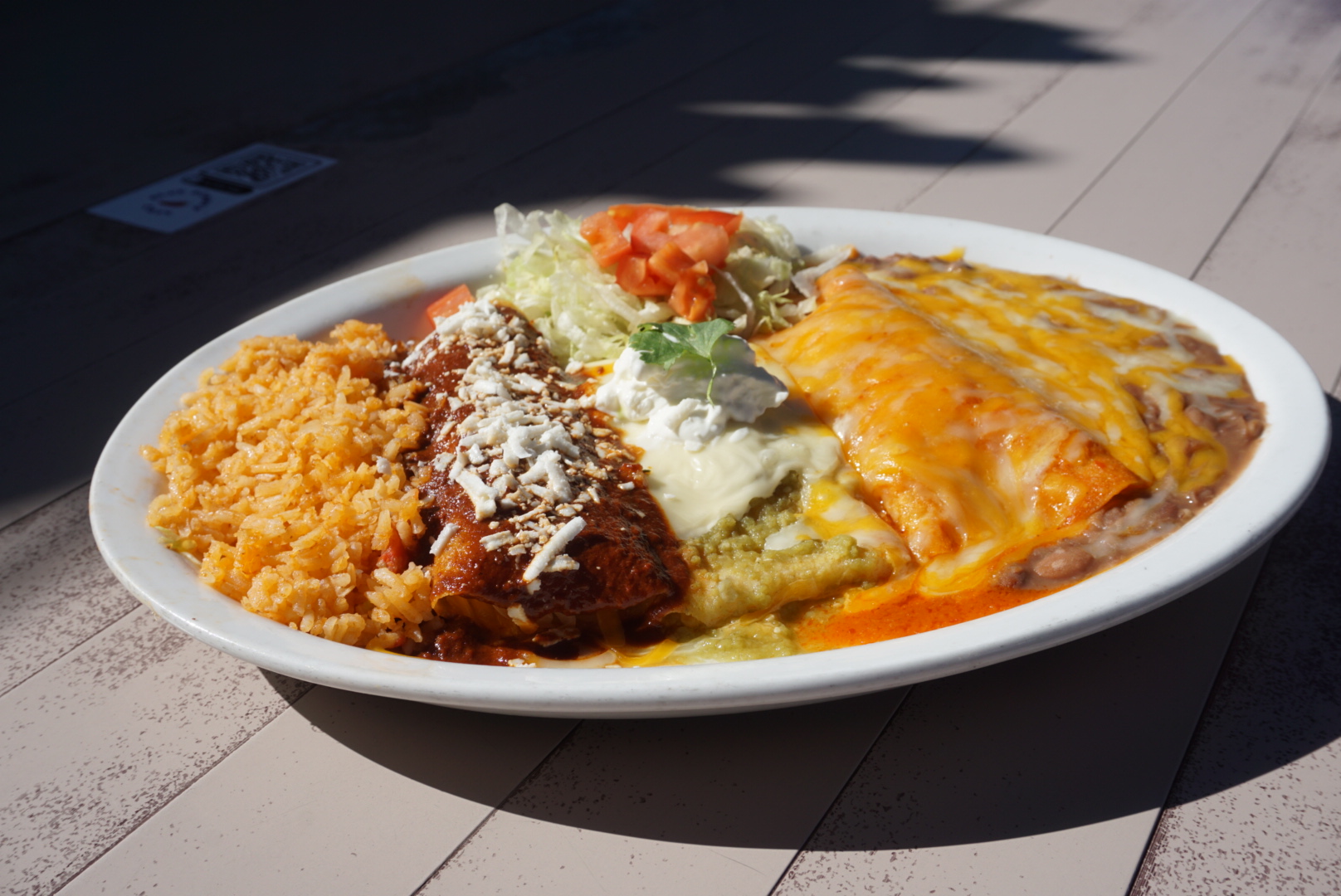 One Mole enchilada, one Suizas enchilada and one cheese enchilada. Served with rice and beans. No substitutions