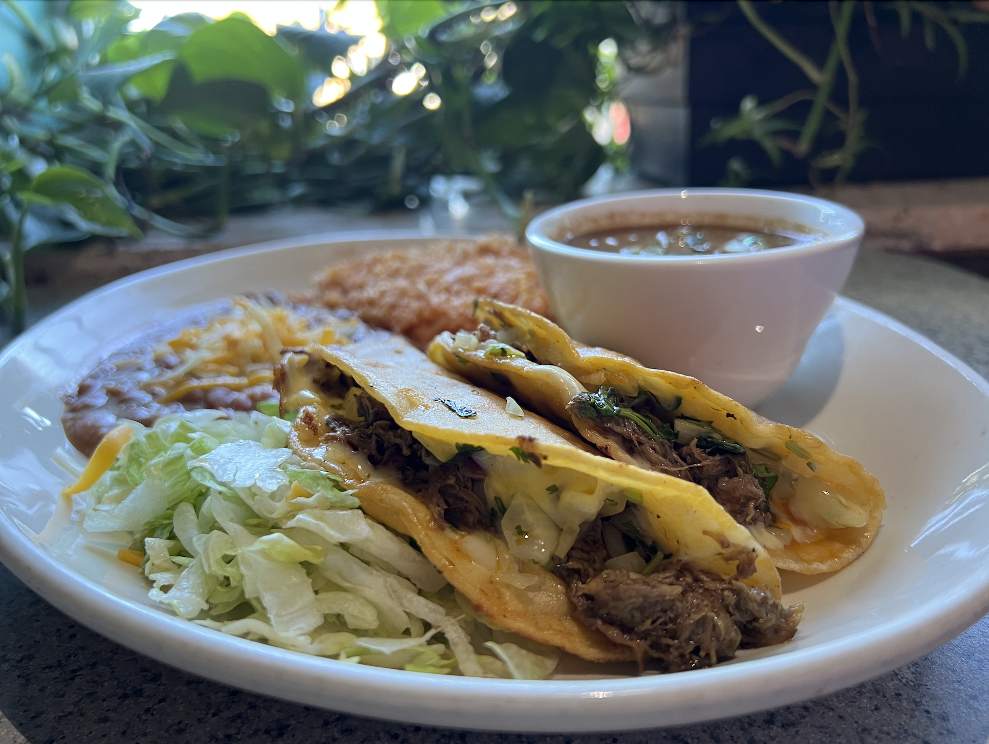Two red stained tortillas with tender shredded beef and menonita cheese. Served with birria stew for dipping