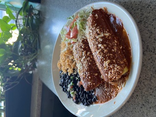 Two corn tortillas rolled up with shredded chicken, smothered in our homemade mole sauce and topped with cotija cheese. Comes with rice and black beans