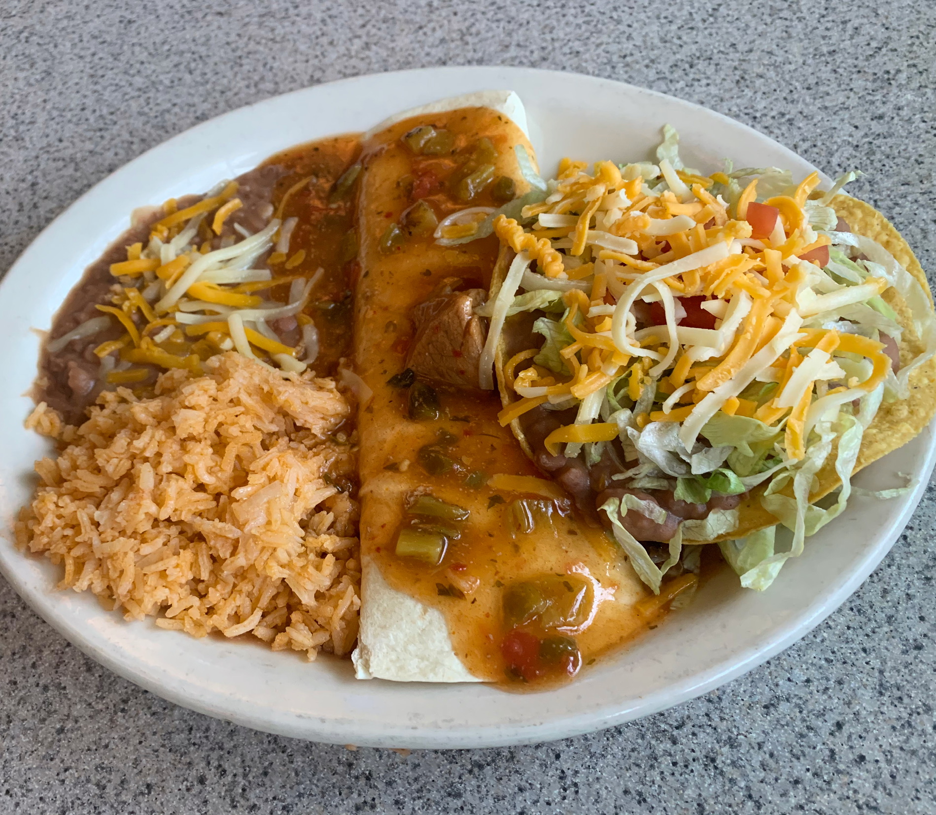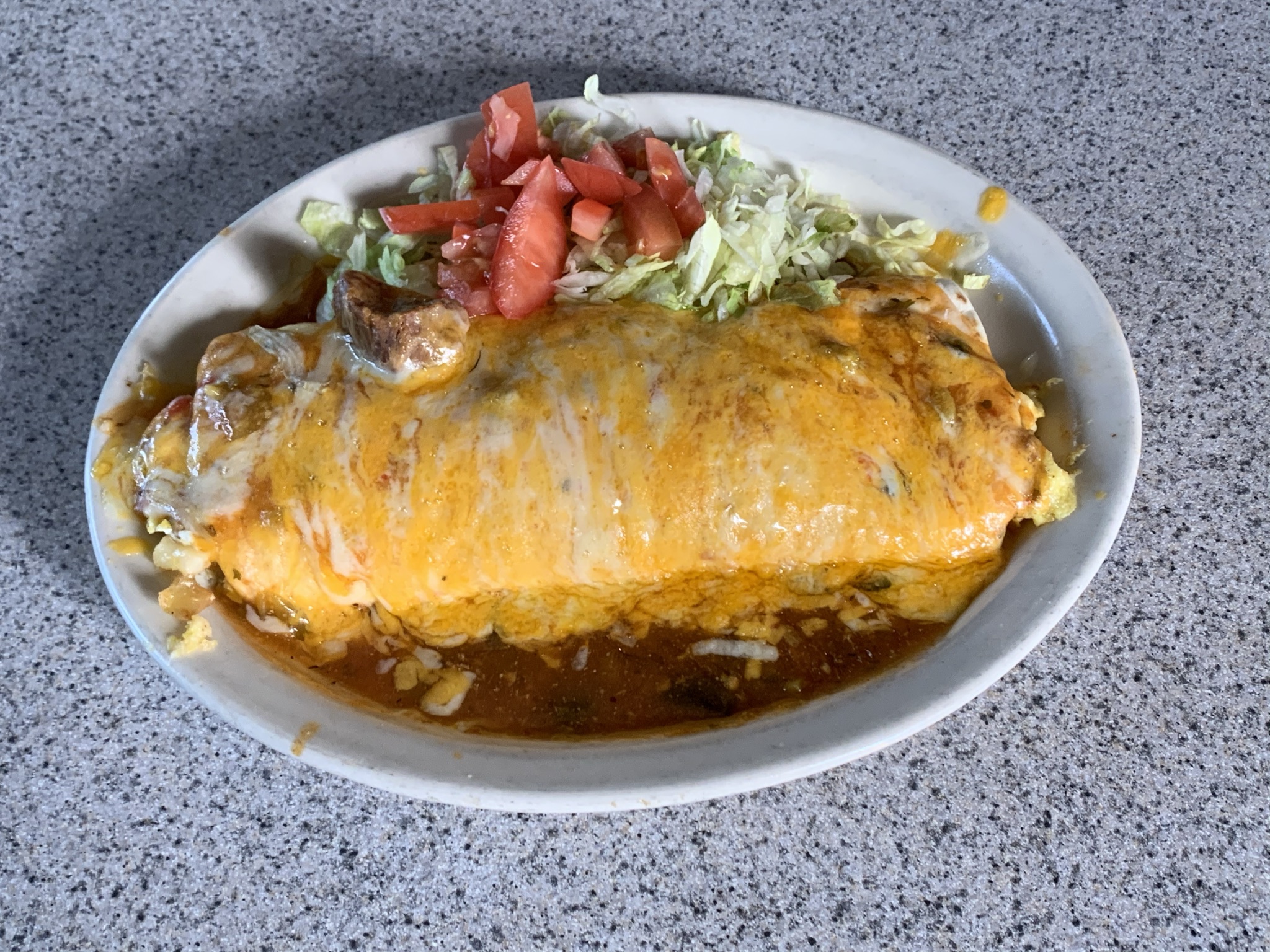 Scrambled eggs, breakfast potatoes, pico de gallo wrapped in a flour tortilla smothered with green chili and cheese