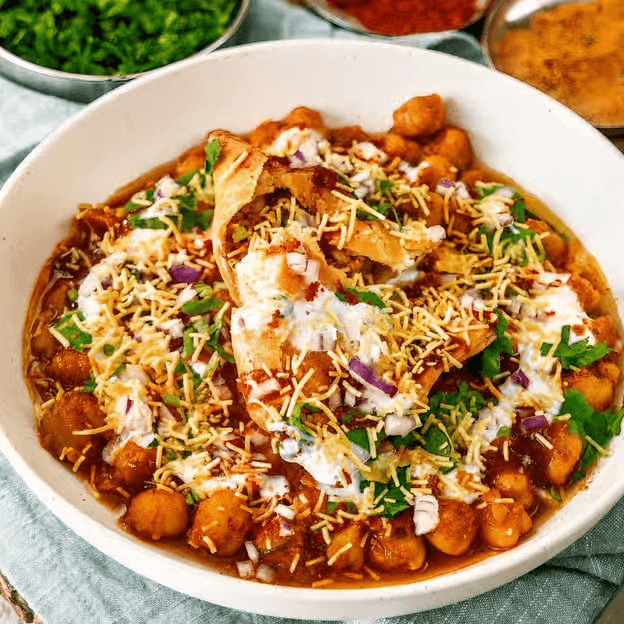 Crushed samosas topped with spiced chickpeas, yogurt, tangy tamarind, mint chutneys, and a sprinkle of fresh herbs for a burst of flavors.