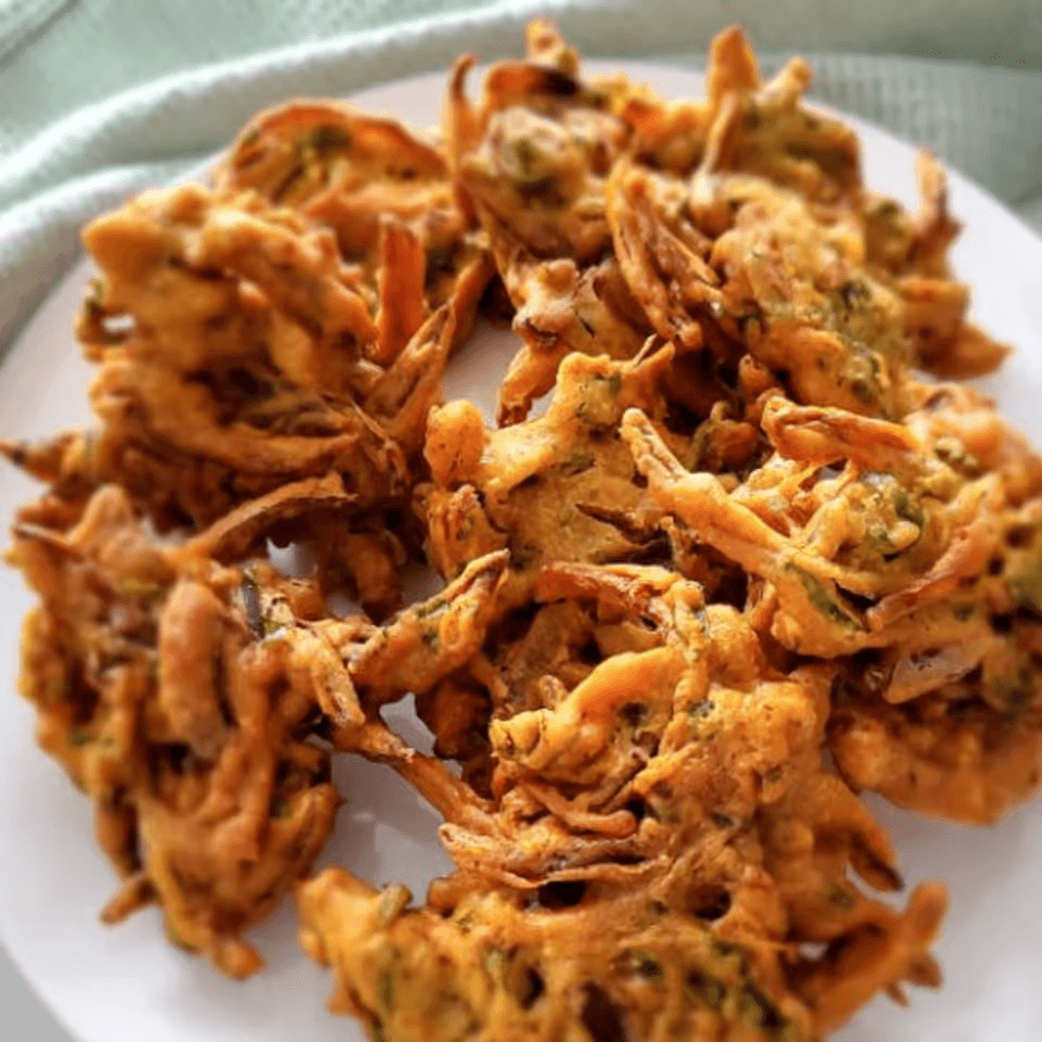 Thinly sliced onions mixed in a spiced chickpea flour batter, deep-fried until golden and crispy, served with mint & tamarind chutney.