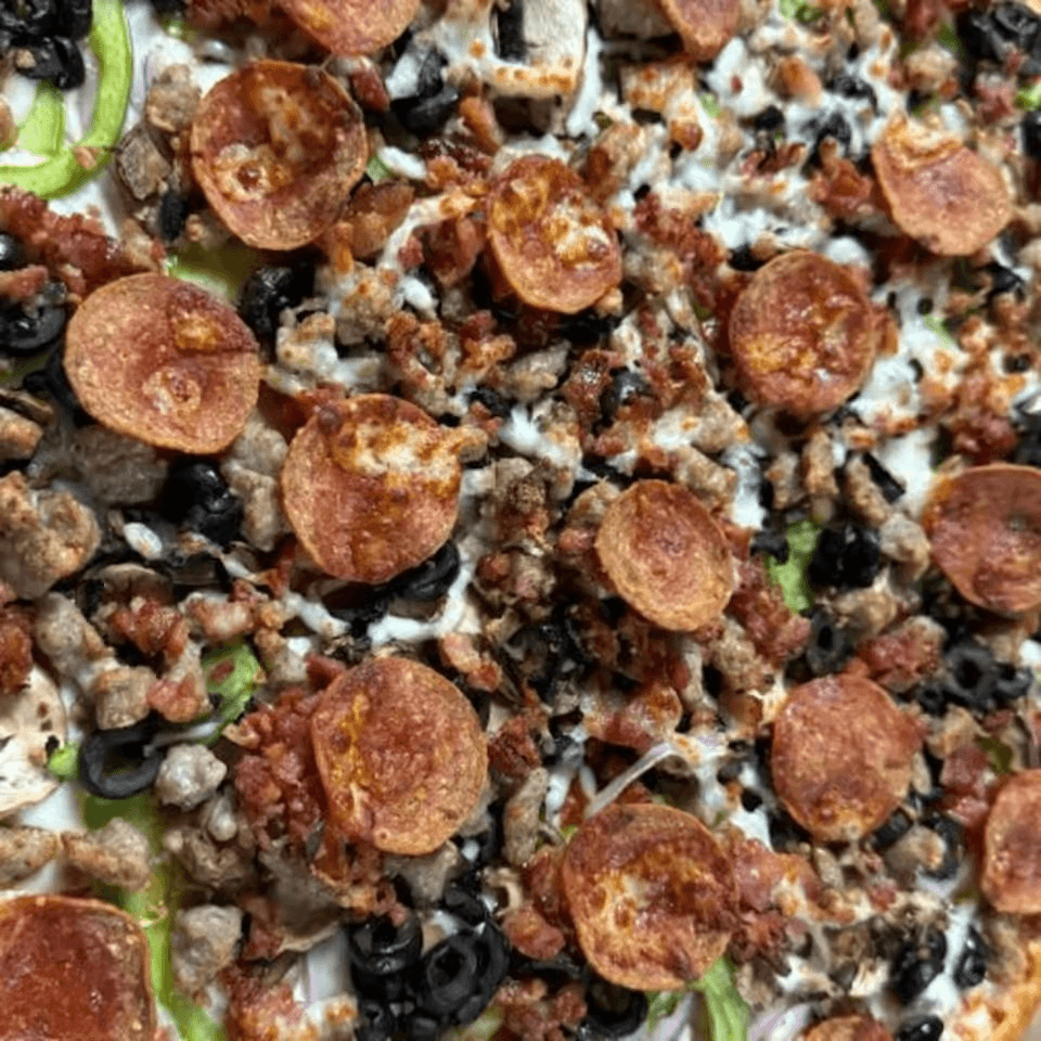 House-made crust topped with our signature marinara sauce, mozzarella cheese, mushrooms, onions, green bell peppers, black olives, Italian sausage, bacon, and pepperoni. One of our best and most loved house favorites!.