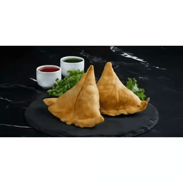 2 pieces of fried pastry filled with savory spiced potatoes and peas or melting cheese