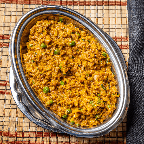 Grilled eggplant cooked with peas, potatoes, onions, and rare spices. Note: If you enter a special request that requires or adds extra ingredients, the restaurant may apply an additional charge of up to $5 without prior notice. If the cost exceeds $5, the restaurant will contact you for approval before proceeding.