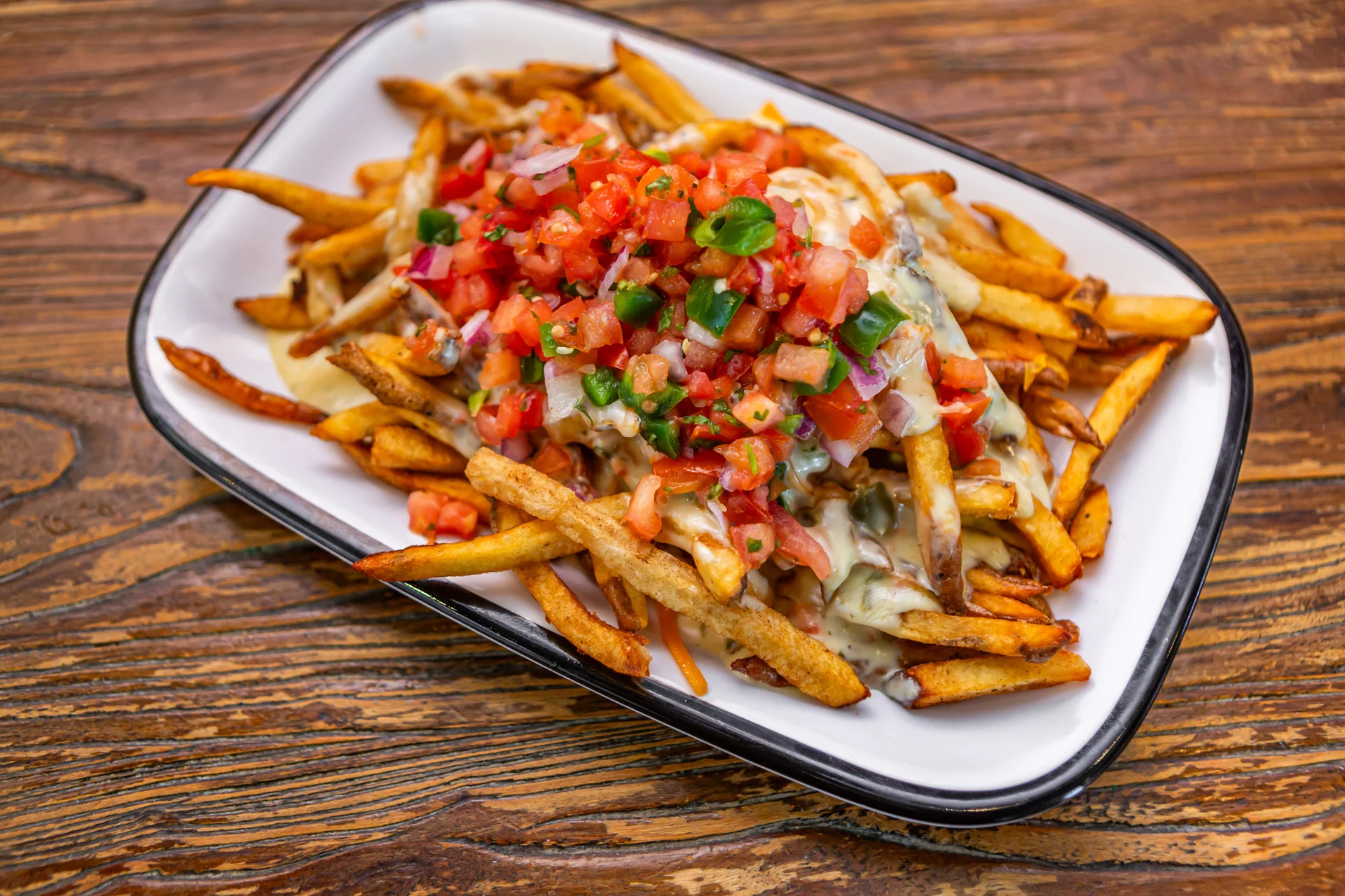 Housemade, double fried and seasoned to perfection with our Green Chile Queso, Pico de Gallo and Shredded Cheddar