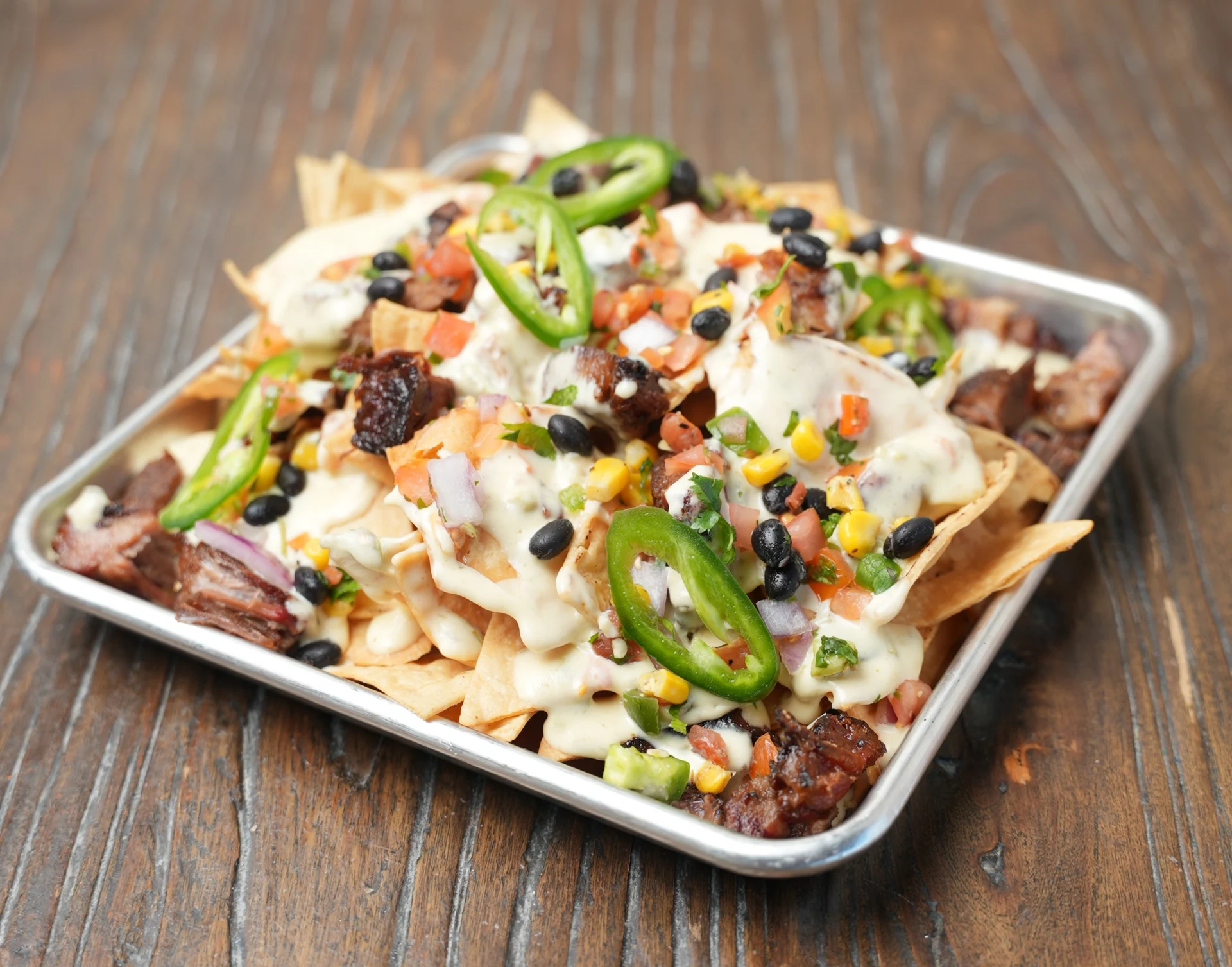 Fresh fried corn chips, Green chili Queso, Fresh Pico de Gallo, Black Bean and Corn Salsa and Fresh Jalapeno. Add Al Pastor Chicken or Guac for $3 each