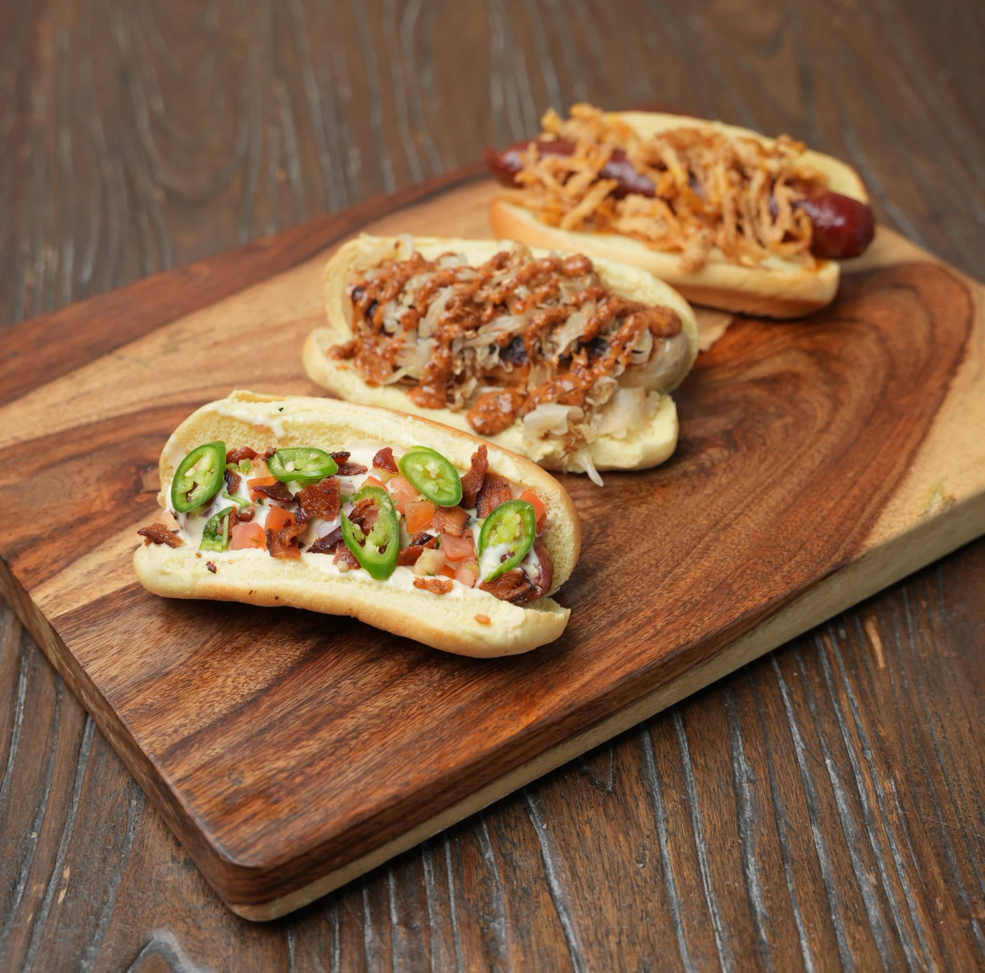 cheddar jalapeno, beer brat or spicy hot link served in one of our signature styles. Chicago: green relish, red onion, tomato, pickle, sport pepper, mustard and celery salt. The Tar Heel: bacon jam, fried onions, carolina bbq. Berliner: sauerkraut and spicy brown mustard. Texas chili: red chili, cheddar cheese and onion. Tex-Mex : sliced serano, pico de gallo, bacon and queso.