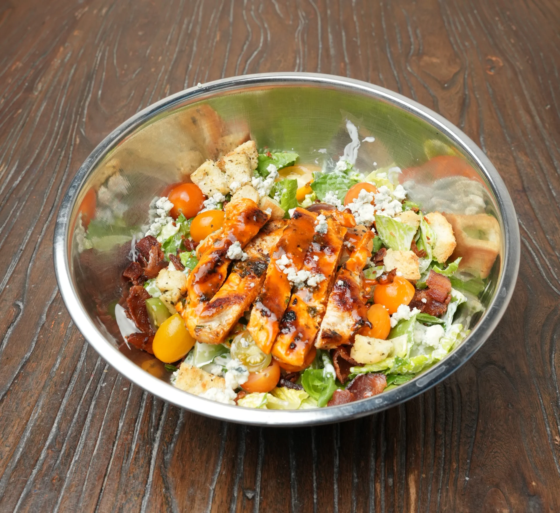 grilled or fried chicken tossed in house made buffalo sauce w/ fresh bacon pieces, romaine and tomato tossed in your choice or house made blue cheese or ranch dressing