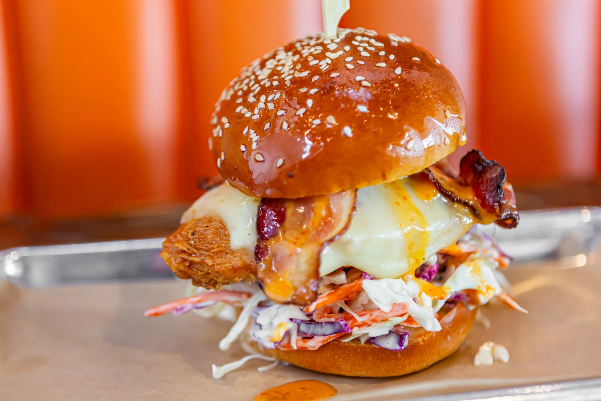 marinated chicken breast fried to perfection, pepper jack cheese, pecanwood smoked bacon, cole slaw and sriracha honey mustard