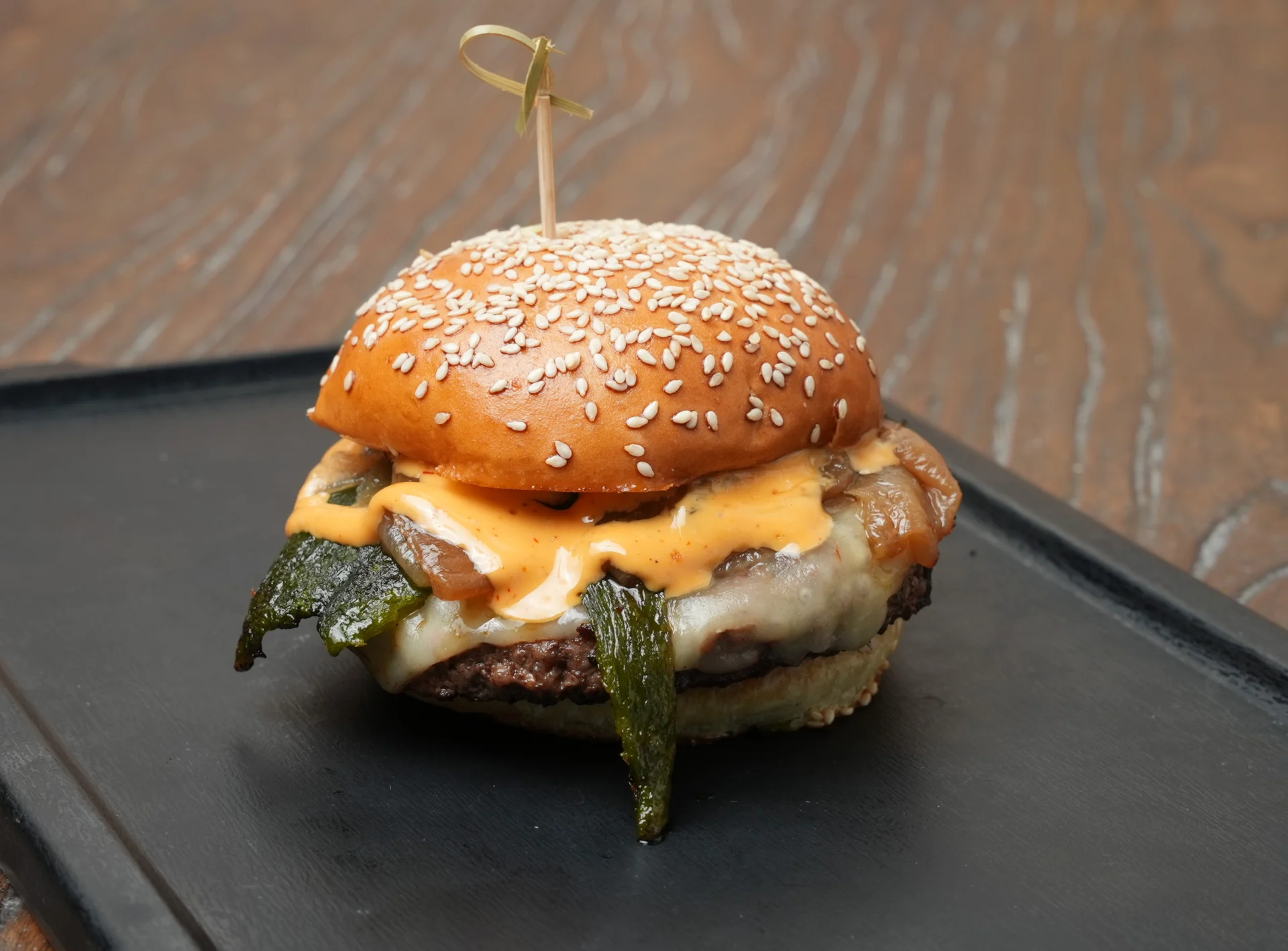 Angus Beef*, caramelized onions, roasted seasonal chili, chipotle mayo, pepperjack cheese