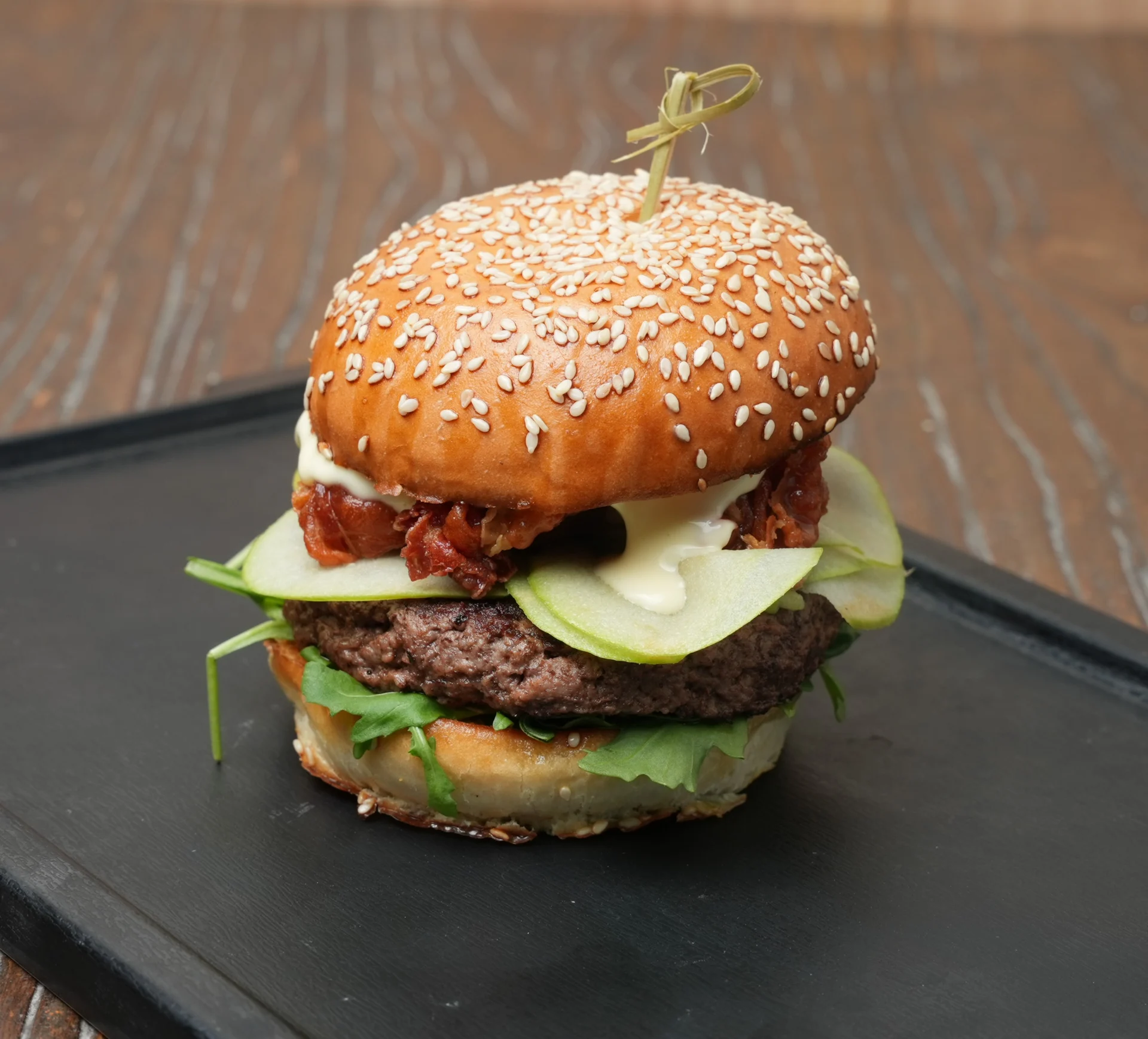 angus beef*, brie cheese, crispy prosciutto, arugula, green apples and stoneground mustard sauce