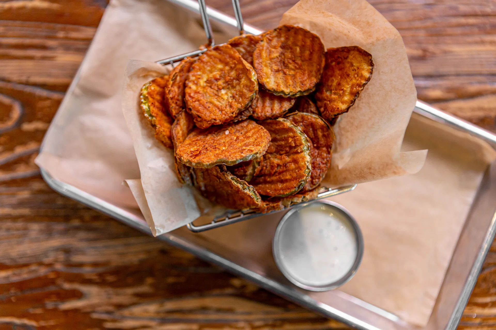 Hand battered dill pickle chips served with our house-made ranch dressing.