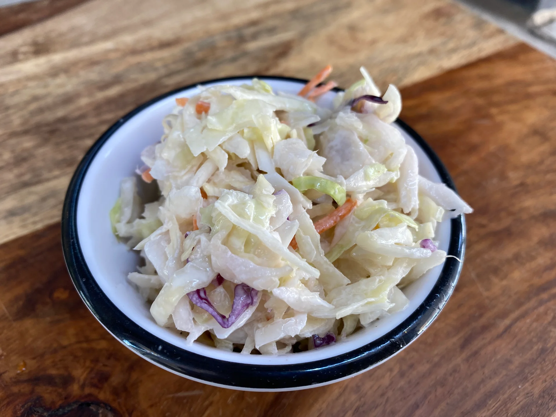 A white and red cabbage blend with shaved carrots and our housemade dressing