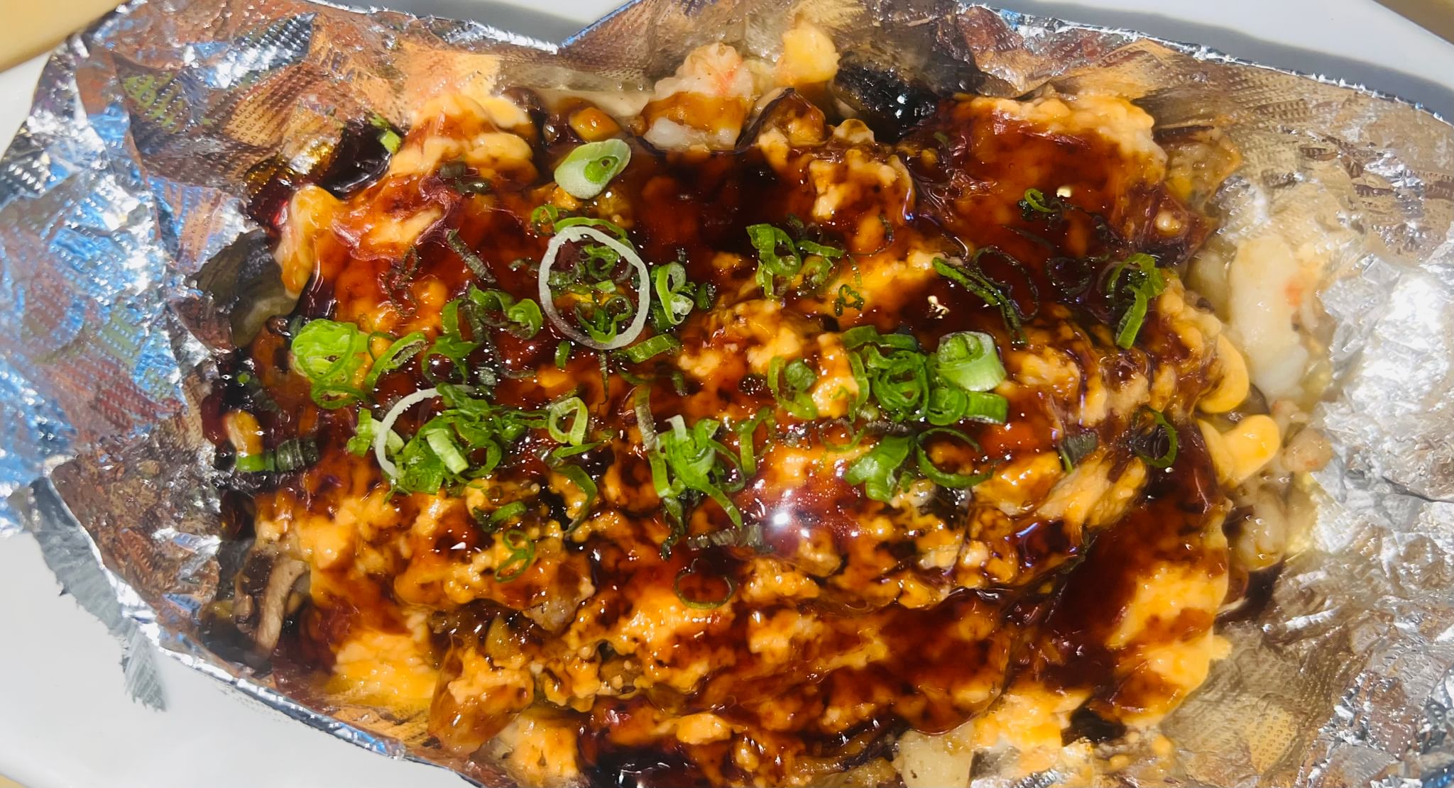 Baked mussels with mayo,masago,Eel sauce,Scallions