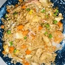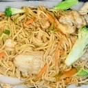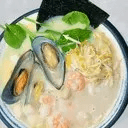 Chicken broth, shrimp, scallops, mussels, crabmeat, spinach, bean sprouts, corn, egg, fish cake, and scallions