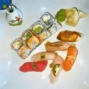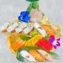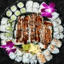 Sushi 5 pieces each: eel, tuna, salmon, shrimp, yellowtail, super white tuna. Rolls: spicy salmon roll, spicy tuna roll, salmon roll, tuna roll, rainbow roll, Alaska roll, unagi roll, California roll, and shrimp tempura roll