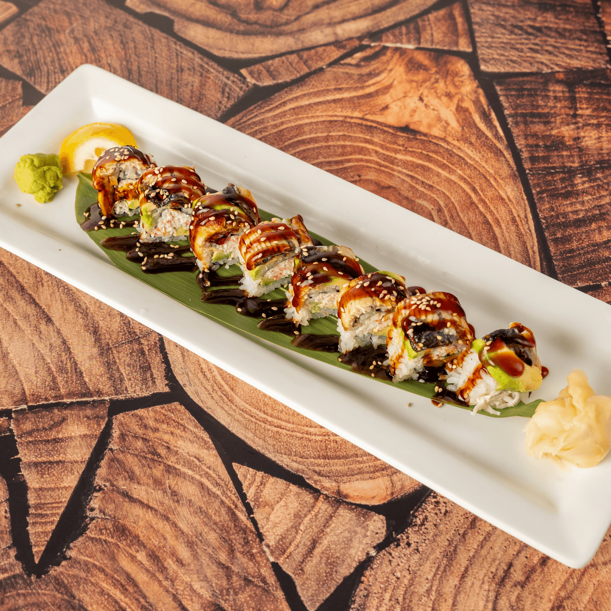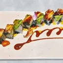 Shrimp tempura, cucumber, avocado inside, and crabmeat on top,Eel sauce & special sauce .