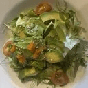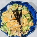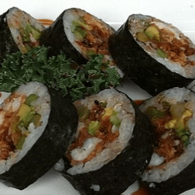 Avocado, spicy kani, top with eel sauce, spicy mayo and masago and scallion.