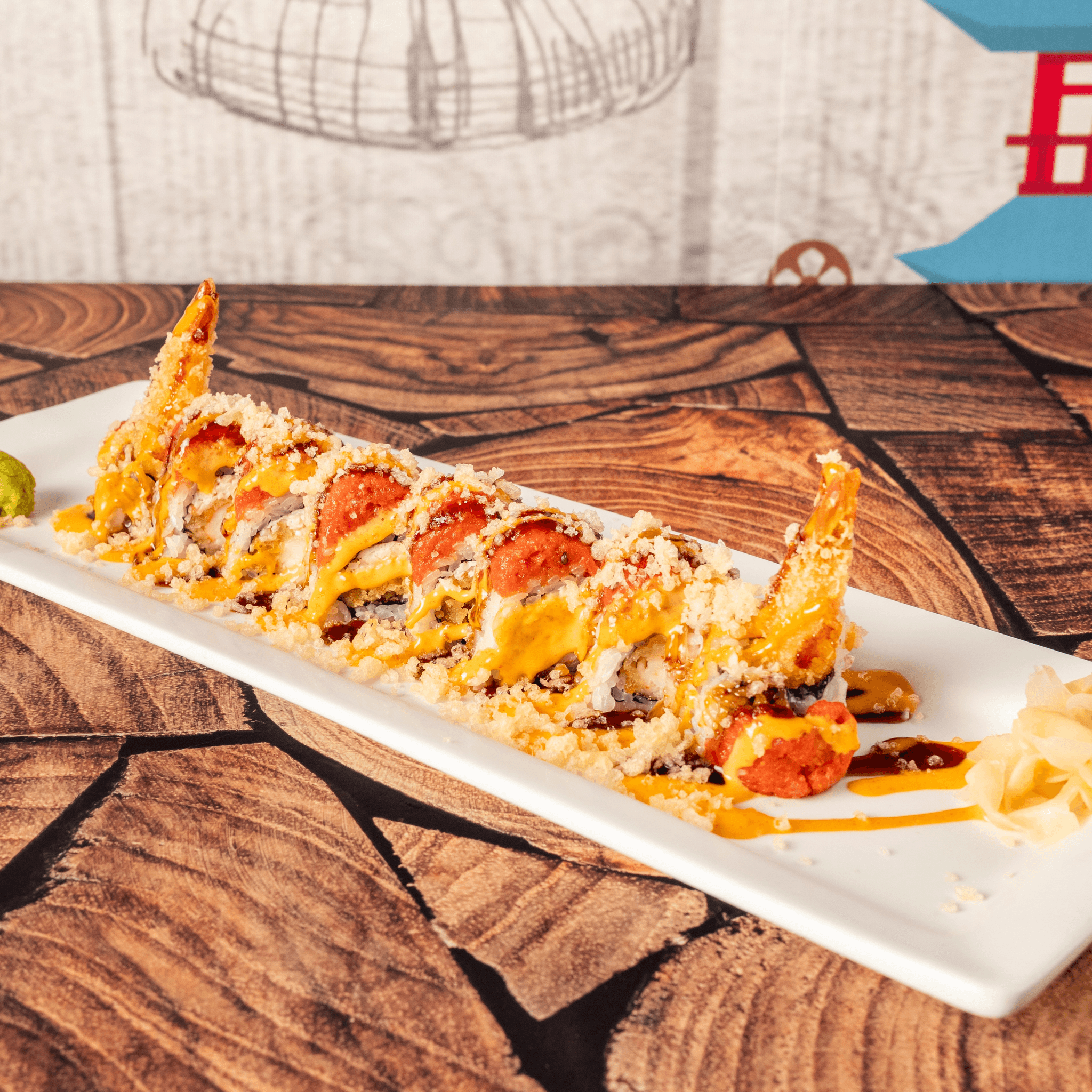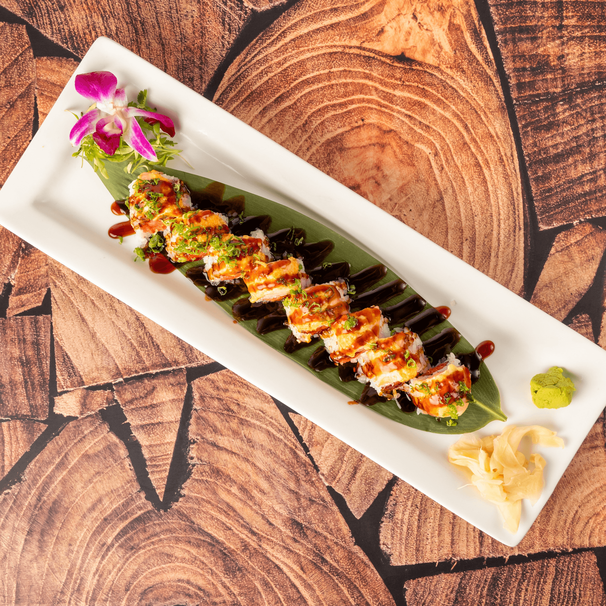 Deep-fried white fish, kani, topped with shrimp, mango, and avocado,Eel sauce & special sauce.