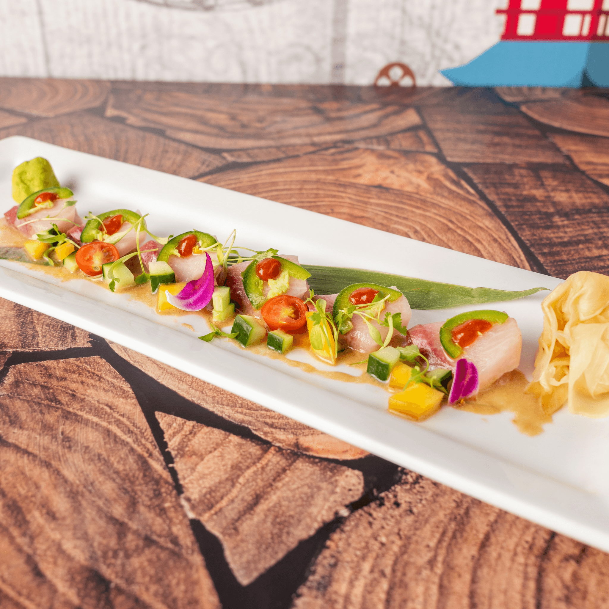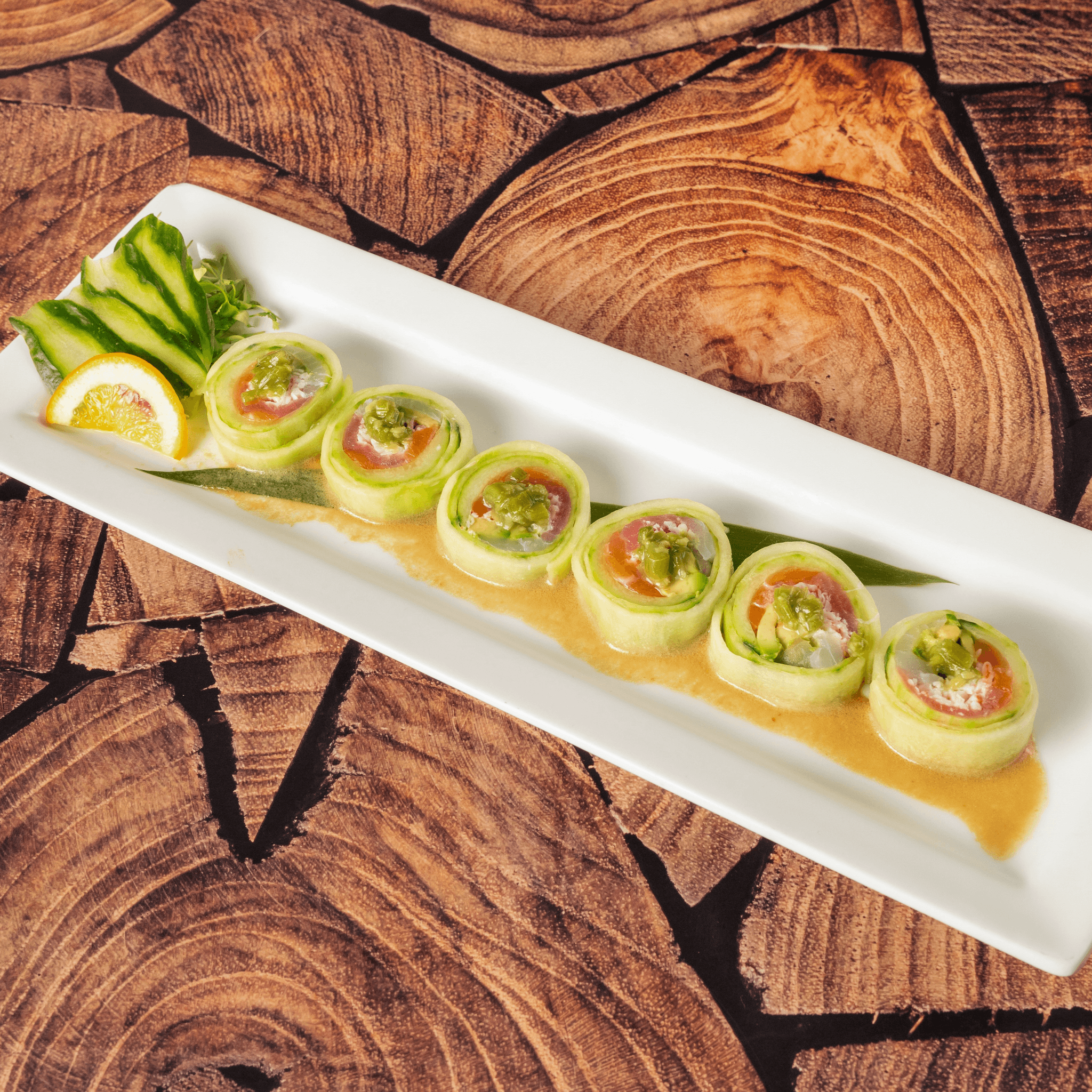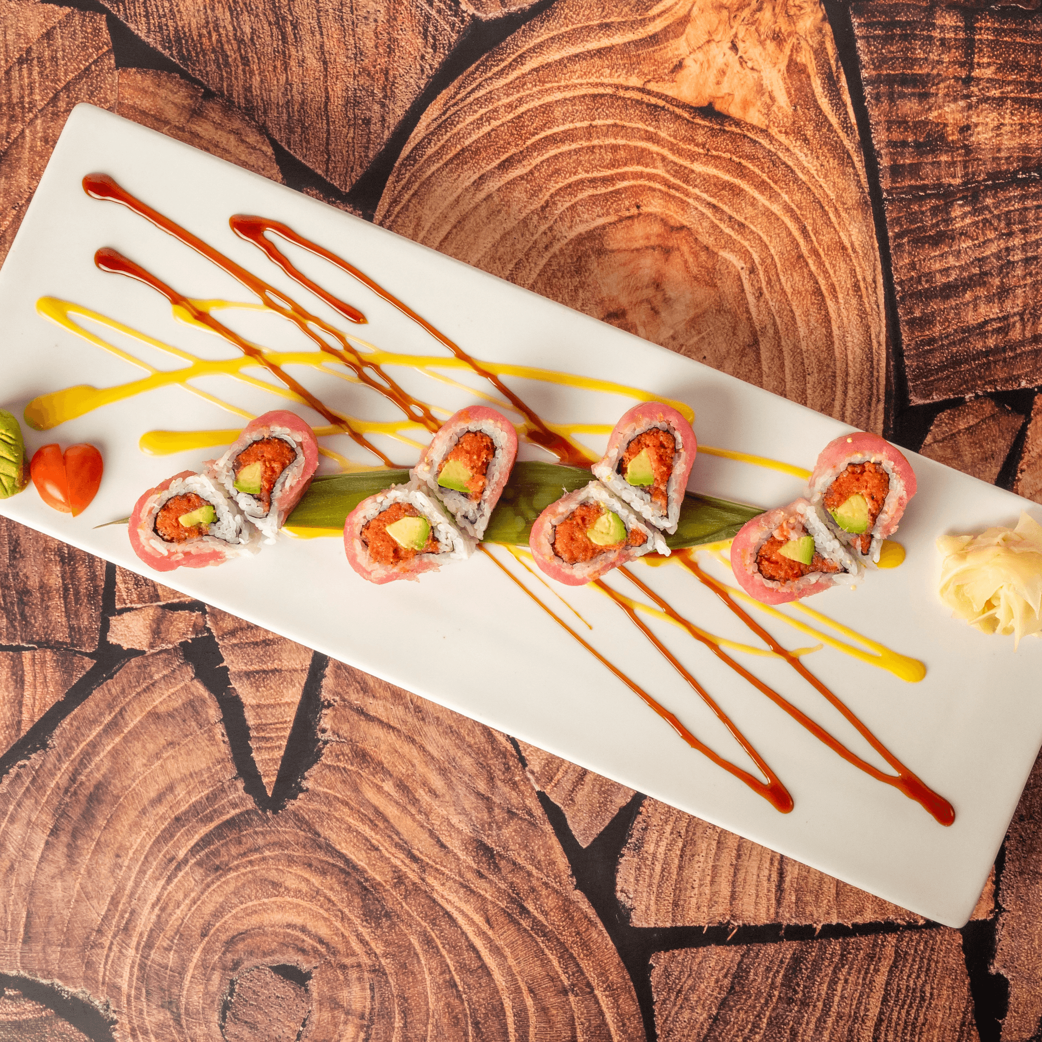 Yellowtail, cucumber, avocado, topped with black pepper tuna & jalapeño,Tataki sauce.