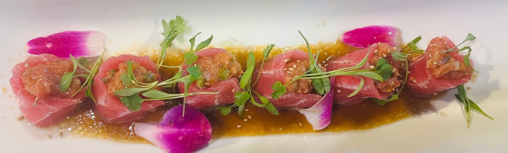 Tuna rolling with spicy tuna, onion, tataki sauce, and mico cilantro.