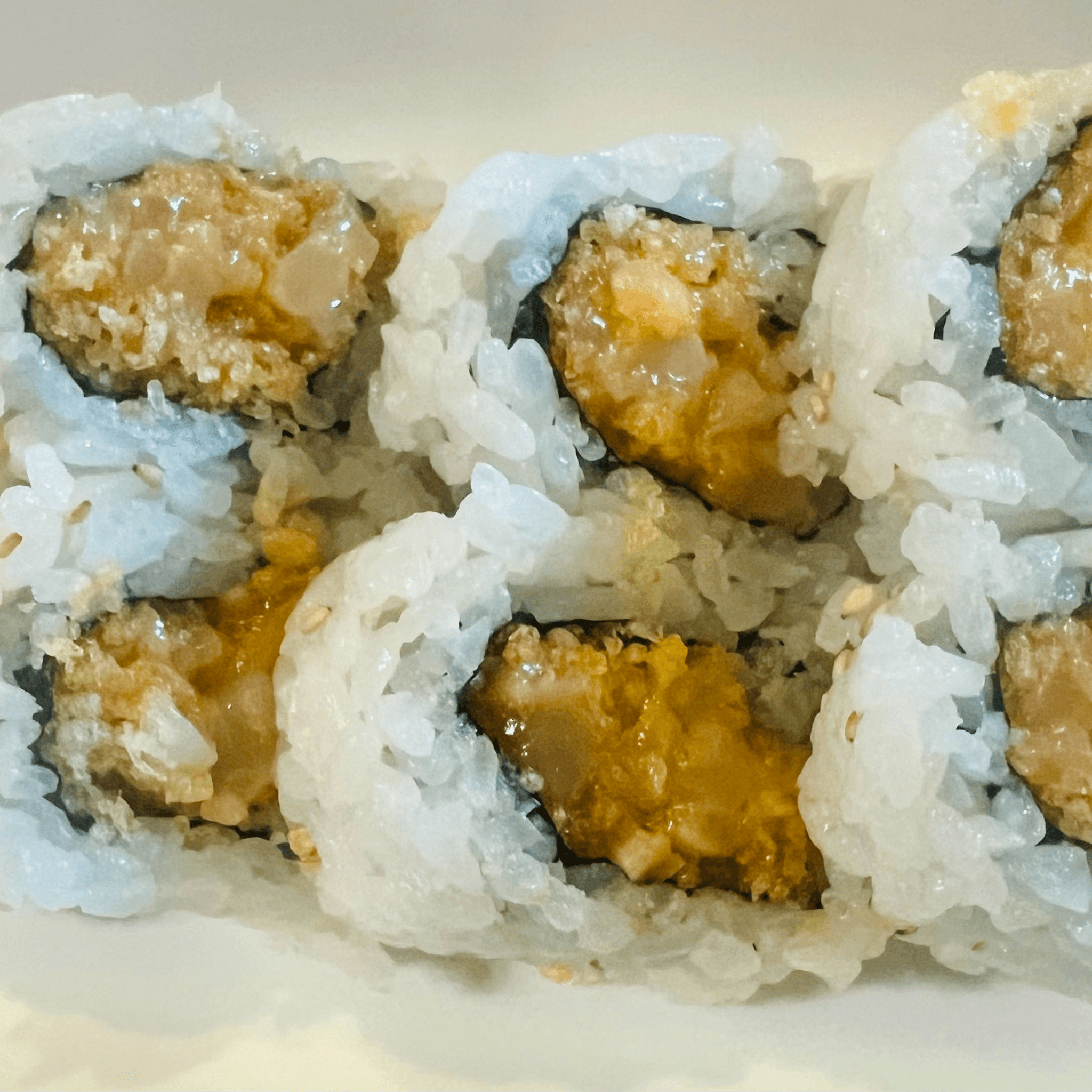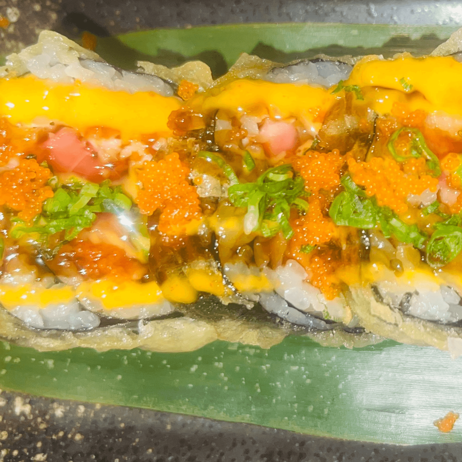 Spicy lobster, avocado, cream cheese, deep fried with spicy mayo & eel sauce, flying fish roe,Scallions.