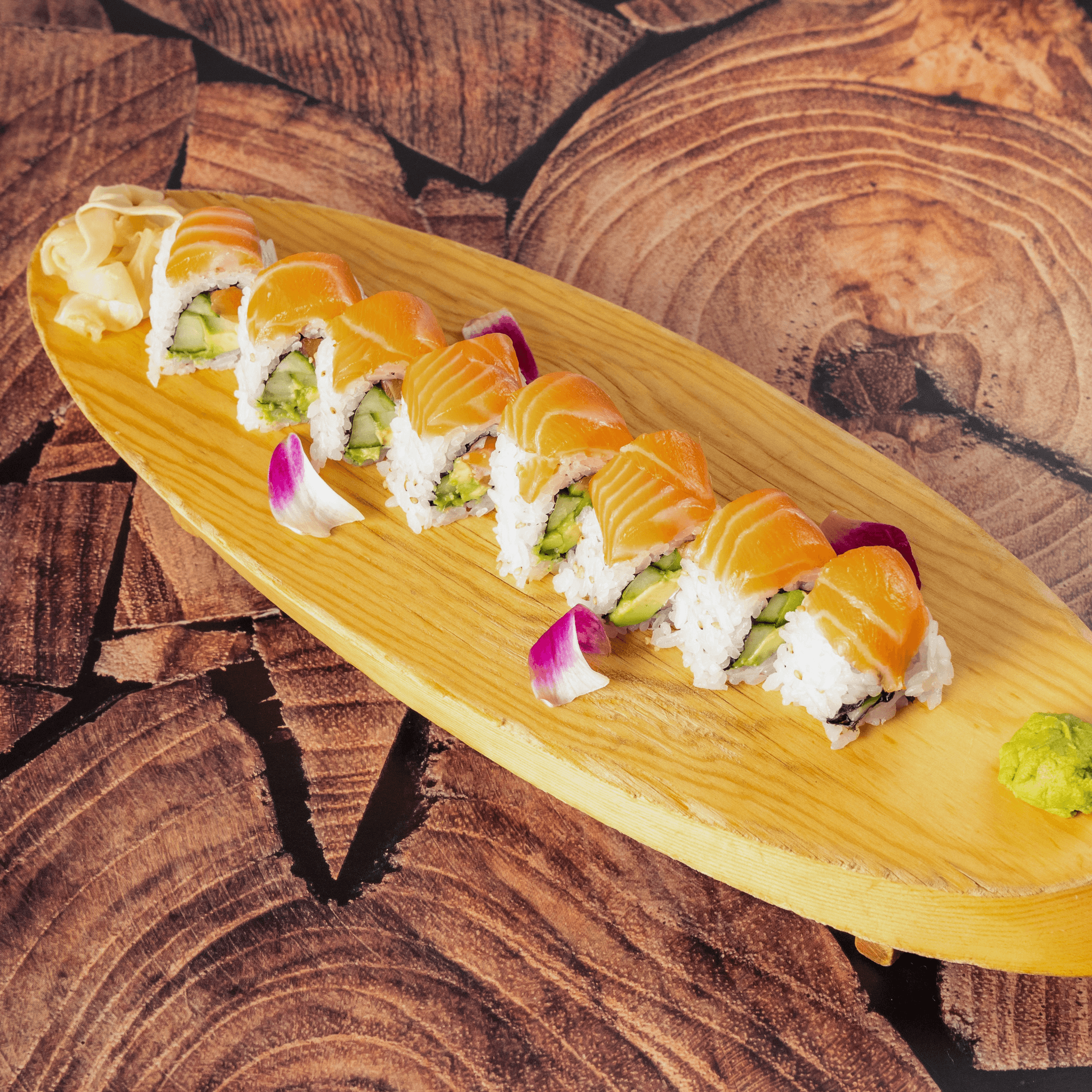 Avocado, cucumber, cream cheese, topped with tuna, salmon, yellowtail & flying fish roe