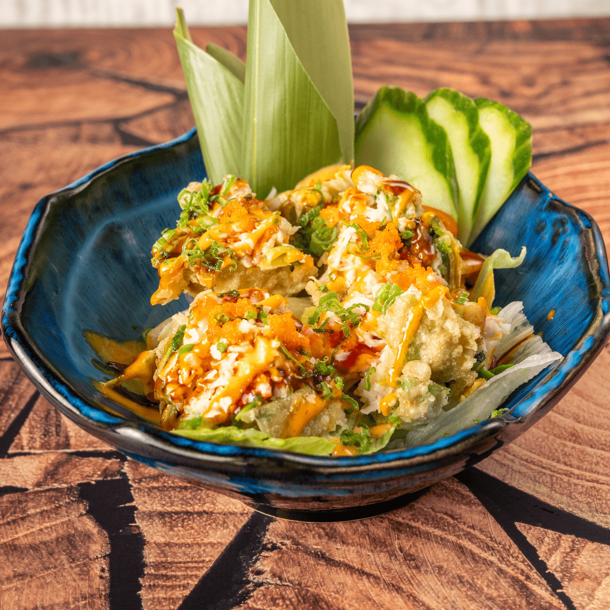 Shrimp tempura, crabmeat, topped with spicy tuna, spicy mayo & eel sauce, crunchy flakes