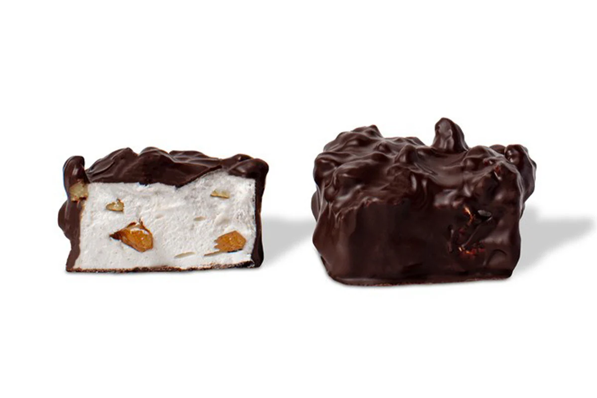 Walnuts mixed into a fluffy handmade marshmallow covered in semi-sweet dark chocolate