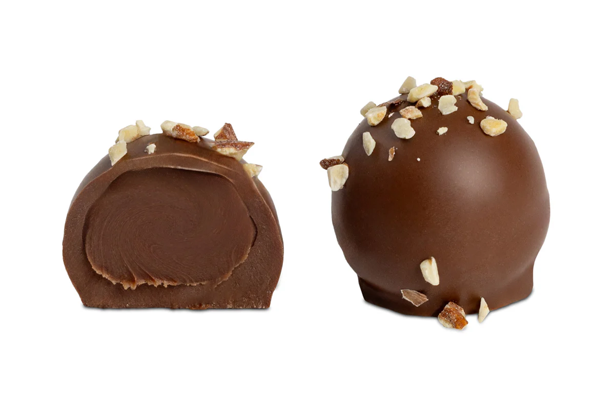 Toasted almond flavored ganache center in a milk chocolate shell, topped with almond pieces