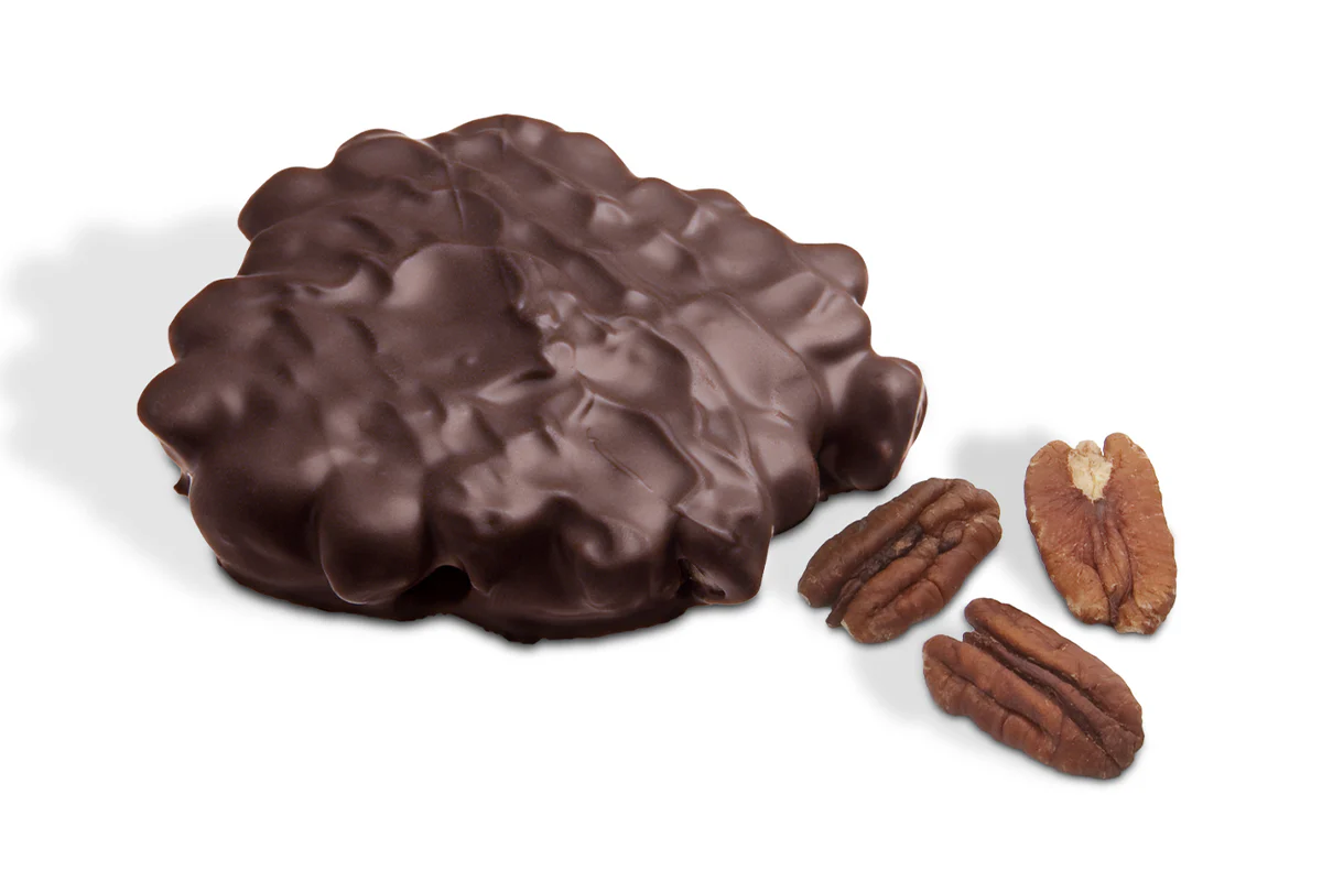 Chewy caramel with pecans covered in semi-sweet chocolate