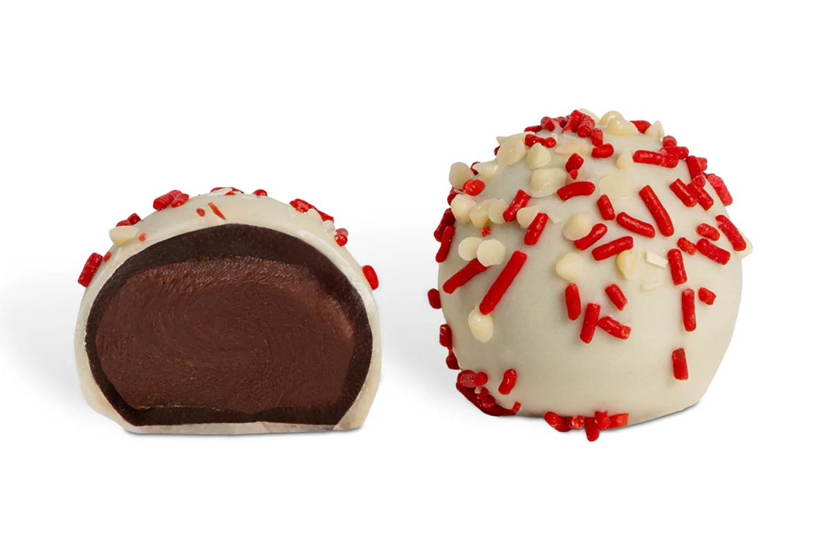 Red velvet flavored ganache center in dark chocolate and white confection, topped with sprinkles