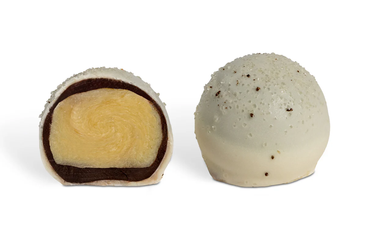 Vanilla flavored ganache center in dark chocolate and white confection, topped with vanilla sugar